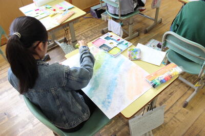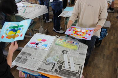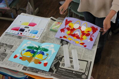 図工の学習です。絵の具でいろいろな模様を作り出しました。道具を使ったり、半分に折った画用紙の片面にたっぷり絵の具をのせて、また折って、空いている側に転写します。開けてみるとどんな模様になっているかワクワクドキドキしながら楽しみました。