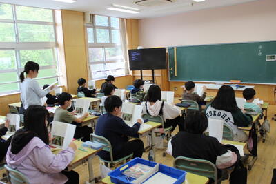 理科の学習です。今日はびんに酸素を詰めて、そこに火のついたろうそくを入れるとどうなるかの実験でした。それぞれの班で協力しながら、上手に実験を進めていました。