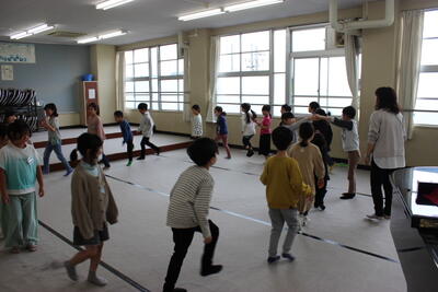 音楽の学習です。「ロンドン橋おちた」の曲に合わせてゲームをしました。ロンドン橋役の二人の間を歩いて、「おちた」の歌詞のところでロンドン橋役の二人につかなった人が、次の橋役をするというゲームでした。みんなドキドキハラハラしながら楽しんでいました。