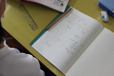 社会科の学習です。地形を平面で表すのに活用される等高線の学習をしました。色の変化で高さを表します。実際にイメージしながら、手を使って高さをなぞっていきます。