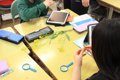 理科の学習です。アブラナの花を使って、植物の花のつくりを観察しました。花がどんなつくりになっているか、一つ一つ丁寧に分解しながら確認していきます。一つの花に花びらは何枚あったかな?