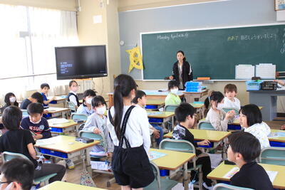 今年度初めての外国語活動です。新しいALTの先生をお迎えして、まずは一人一人自己紹介しました。名前と好きなことや好きなものを英語で伝えました。