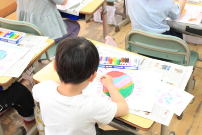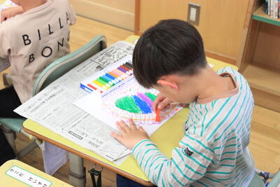 図工の学習です。まっさらなクレパスを使って、自分が考えた「お日さま」を描きました。色とりどりのいろいろなお日さまが完成しました。みんな夢中で描いていました。とっても素敵なお日さまばかりでした。
