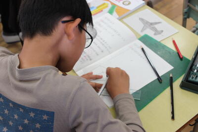 算数で「対称な図形」という学習に取り組んでいます。今日は線対称な図形をかく方法を学びました。みんなルールを守りながら丁寧に作図ができました。