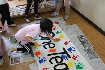 学年目標「One Team」を一人一人の手形で飾っていきます。みんな思いを込めて、ぎゅっと紙に手を押し付けていました。素敵な学年目標が完成しました。