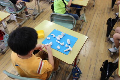 図工の学習です。粘土をにぎにぎしながら、何を作るか考えます。ぎゅっとにぎってできた形から発想を広げて、思いついたものを自由に制作しました。にぎにぎすると脳にも刺激がいって、一石二鳥かも・・・
