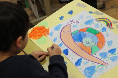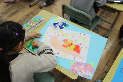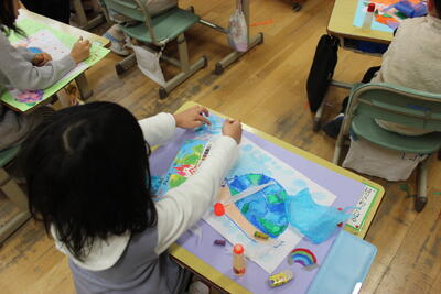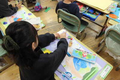 図工の時間です。校内作品展に向けて、1学期に描いた作品をアレンジしました。八つ切り画用紙に書いた絵を四つ切の画用紙に貼り、周りをアジサイで飾っていきました。1学期の作品がより素敵になりました。