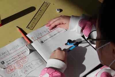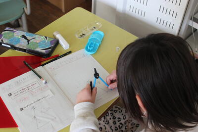 算数の学習です。コンパスを使って二等辺三角形や正三角形のかき方を学びました。道具を上手に使いこなして、正確に作図をしていきます。