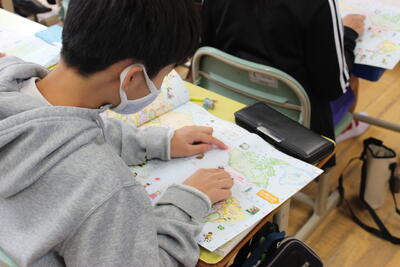 社会の学習です。世界の国々を調べていきます。まずは世界にはどんな国があるのか、地図帳の世界地図を使って確認します。先生が言う国を地図上で見つけていきました。