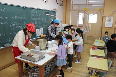 今日は、1年生にとって初めての給食でした。これから中学校まで食べていく給食のまさに初日でした。先生たちがよそってくれたおかずやご飯をお盆にのせて、慎重に自分の席まで運びます。みんな目の前にある給食を眺めて、興味津々。どんな味なのか、ドキドキワクワク状態でした。みんなに給食がいきわたると、みんなごあいさつ。「手を合わせましょう。いただきます。」はじめから大口開けて食べる子や恐る恐る口に運ぶ子などなど、様々でした。でも最後はみんな「おいしかった~」。