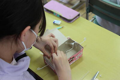 図工の時間です。くるくるクランクという工作に取り組んでいます。箱の横から出た針金を回すと上に付けたものが動く仕掛けです。高くなったり、引っ込んだり。その動きの特徴をうまく生かす作品に仕上げていきます。