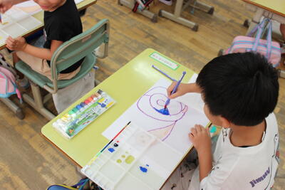 図工の学習です。今日は初めて絵の具セットを使います。一つ一つの道具の使い方を学び、いよいよパレットに絵の具を出して、絵に色を着けていきます。水加減で濃くなったり、薄くなったりすることも体験しながら、作業を進めました。