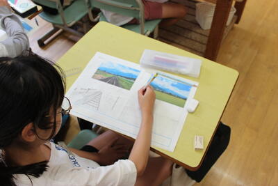 図工の時間です。遠近法の練習をしました。写真を見ながら、平面に対して奥行きを出すのはどうすればよいかを考えて描きました。この技術がこれからの制作活動に活かされていくことを期待しています。