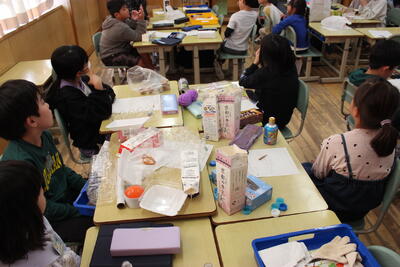 図工の学習です。自分で持ってきた空き箱や容器を使って、どんなものが作れるか考え、交流しました。形からイメージを広げ、完成形を想像して、発表していました。