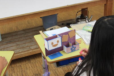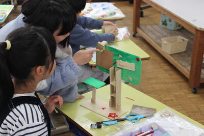 図工の学習です。設計図から板を切り取り、組み合わせて伝言板を作ります。立体的な伝言板が出来上がりつつあります。