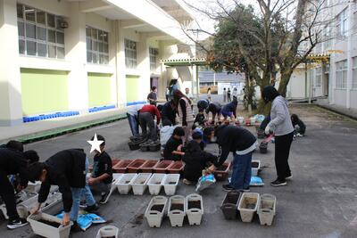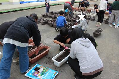 子育て支援協議会の活動で「花いっぱい運動」があります。今日はその花植えの準備が行われました。100個ほどのプランターに土を入れていく作業です。教会の方々と環境委員会の児童が一緒に作業しました。児童にとっては地域の方と触れ合う貴重な機会となりました。
