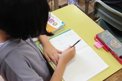 算数の授業です。重さの学習をしています、教科書についている秤を組み立てて、消しゴムと定規の重さ比べをします。ただ直接比べるのではなく、「1円玉」という任意単位を使って比べます。このような具体的な操作活動をしながら、普遍単位の便利さを実感的に学んでいきます。