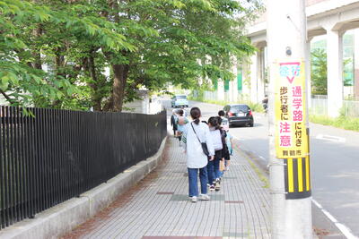 PTAによる5月のあいさつ運動・登校指導を行っていただきました。登校中は、見守りがあるせいか(?)1列にきちんと並んで歩けていました。門のところで並んで出迎えてくれているPTAの方々にも元気よくあいさつができていました。毎月、お世話になります。