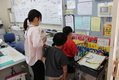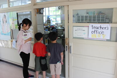 1年生が担任の先生と一緒に、特別教室の鍵を借りに来ました。職員室に入る前と後には決まった言葉があり、それを言わなくてはなりません。担任の先生に教えてもらいながら、言葉も上手に言えました。無事に特別教室の鍵を借りることができました。