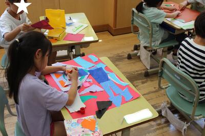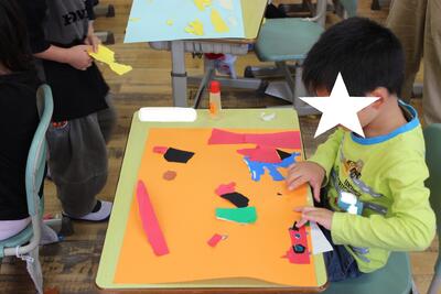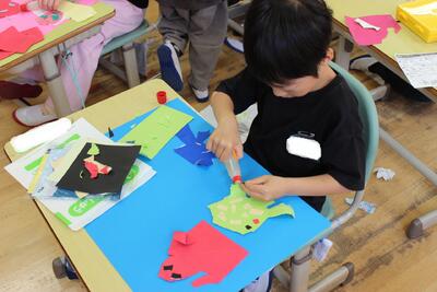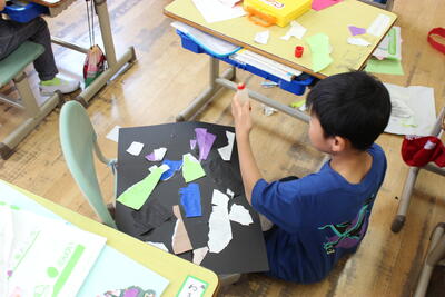 図工の授業です。色紙を無造作にちぎって、ちぎれた形をよーく見ていると何かの形に見えてきます。その見えたものから想像を広げ、楽しい世界を作っていきます。イメージがどんどん広がり、楽しい絵が完成していきます。
