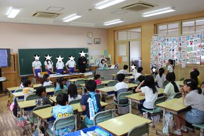 先日行われた陸上大会で入賞した児童の表彰式を行いました。給食の時間に視聴覚室からライブ中継で行いました。天候不順で悪コンディションの中でしたが、参加した児童全員よく頑張りました。参加児童についても、カメラを6年生教室にスイッチし、全校で拍手を送りました。