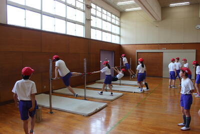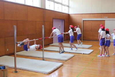 体育の授業です。鉄棒運動に取り組みました。連続技を披露するために、「上がり技」「回転技」「下り技」を練習していきます。自分の得意な技を増やして、かっこいい連続技ができるといいですね。
