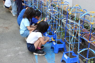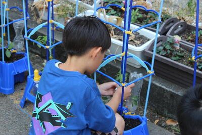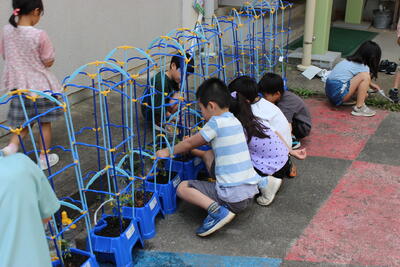 生活科の学習です。ミニトマト、なす、ピーマン、オクラなどの夏野菜の苗を植えました。自分が植えたい苗を選び、植木鉢に植えていきます。植えた後は、支柱に苗を固定し、水をやります。まだまだ弱々しい苗です。丁寧に優しく扱ってくださいね。