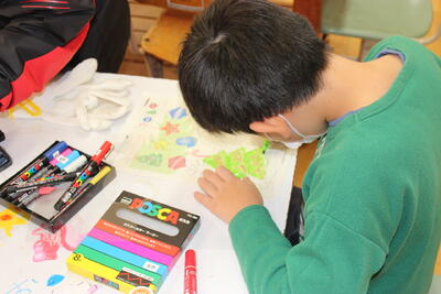 薄い透明のプラスティックの板に好きな絵をかいて、オーブンで焼きます。しばらくすると「チューッ」とプラバンが縮んでいき、固く圧縮されます。あらかじめ穴をあけておいてひもを通せば、オリジナルキーホルダーの完成です。