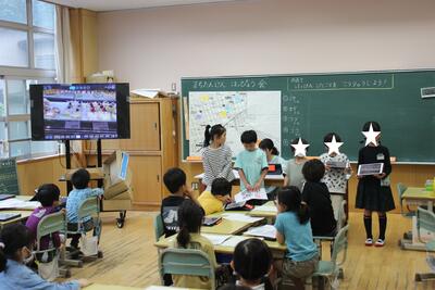 先日出かけた「まち探検」で発見したことの発表会を行いました。ボランティアでお手伝いいただいた保護者の方もご招待しました。自分たちが行ったお店や施設で見つけたことを一人一人発表しました。全部校区内にあるものですので、今度行ってみたいなぁという気持ちにさせる発表会になりました。