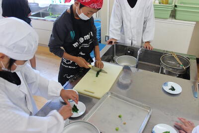 家庭科の調理実習です。今日はほうれん草を茹でます。簡単そうですが、子どもたちにとっては一つ一つの作業が新鮮です。上手に茹でることができました。お皿にちょこんと。上品なおひたしが完成しました。後片付けもてきぱき協力してできました。