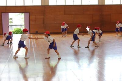 体育の学習です。体ほぐしの運動でゲームを取り入れた運動で体と心をほぐしていきます。お互いの手を近づけて片方は握手をする側、もう片方が逃げる側。先生の「あ、あ、あ、あ、握手」の声を同時にそれぞれが動作を起こします。うまく握れるか。それとも逃れるか。ハラハラしながら楽しく運動できました。