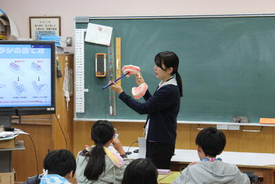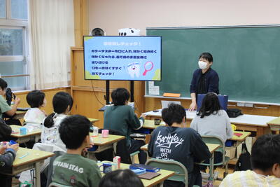 歯磨き指導 10/31 投稿: 学校管理者 (11:45) カテゴリー: 今日の出来事 6年生が市の歯科衛生士さんから歯磨き指導を受けました。正しい歯磨きの仕方を学びます。まず日頃歯がどれだけきれいに磨けているかを確認するため、赤い錠剤を舐めます。口の中でしっかり溶かし、口の中を見てみると歯が赤くなっています。赤色が濃ければ濃いほど歯に汚れが付着している証拠です。鏡に映る赤く染まった自分の歯を見てびっくり!その後、赤色を丁寧に落とす正しいブラッシングを学びました。今日の学びをこれからの歯磨きに活かし、生涯自分の歯でものが食べれるようにしましょう。 Tweet -