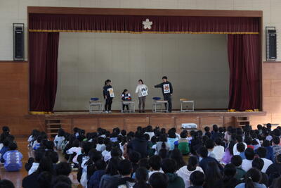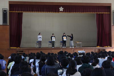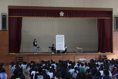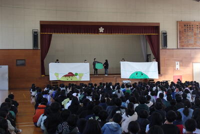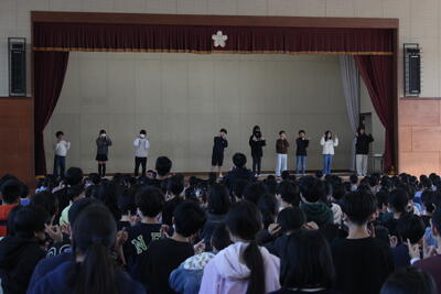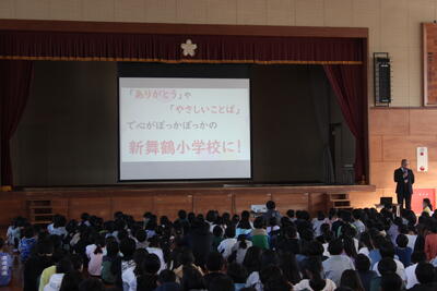 今日11月25日から12月9日まで、新舞鶴小学校では「人権旬間」として人権についていつも以上に考える期間です。今日はその始まりということで全校集会を行いました。全校で「ありがとうの花」を手話付きで歌い、校長先生のお話に続き、児童会からの取組提案がされました。そして最後に職員が友達関係についての劇を披露し、その考える点についてスクールカウンセラーの先生に解説をしていただき、素敵な詩を紹介してもらい集会が終わりました。この期間を全校一人一人が人権についてしっかり考え、さらに誰にとっても居心地の良い素晴らしい学校になることを期待しています。
