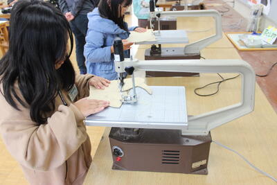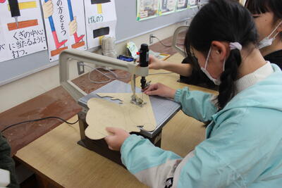 授業の様子(5年生)12/4 投稿: 学校管理者 (15:55) カテゴリー: 授業の様子 図工の学習です。伝言板の制作ですが、一枚の板に絵柄を書いて、電動糸のこを使って切り取っていきます。曲線を電動の糸のこで切り取っていくので、なかなか難しい作業ですが、慎重にけがをしないように取り組めていました。 Tweet -