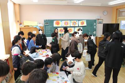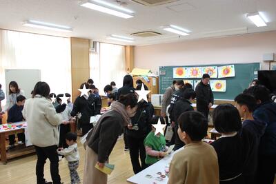 本校区に住んでいて、舞鶴支援学校に通うお友達が来校し、ひまわり学級と交流しました。ひまわり学級の児童がこの日に向けて用意した品物が並ぶお店屋さんを開店し、引換券で品物と交換します。4店開店しましたが、どのお店からも「いらっしゃい、いらっしゃい」と威勢のよい声が飛び交い、ひまわり学級3組の教室はショッピングモールへと変身しました。支援学校のお友達も何回もお店をぐるぐる回り、気に入った商品やお店の人おすすめの商品を券と交換しゲットしていました。大変楽しい交流会となりました。