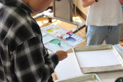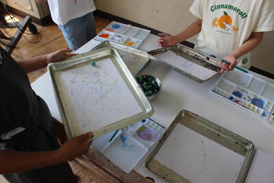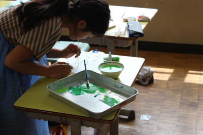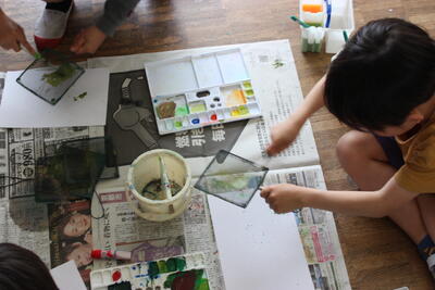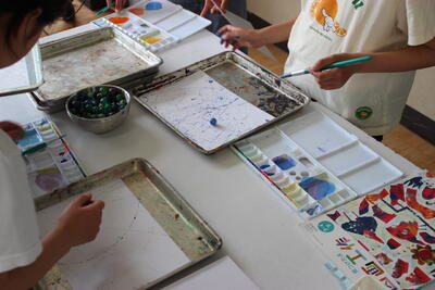 授業の様子(4年生)4/17 投稿: 学校管理者 (14:06) カテゴリー: 授業の様子 図工の時間です。いろいろな技法を使って、模様を描きます。ビー玉に絵の具を付けて転がす。絵の具をそのまま画用紙の上に出して、半分に折って広げる。絵の具のついたブラシで網をこすって画用紙に振りかける。さぁ、どんな模様が出来上がったかな。 Tweet -