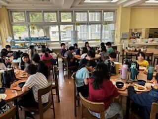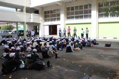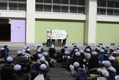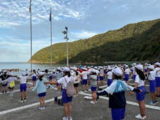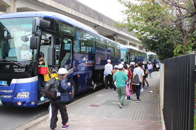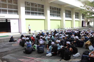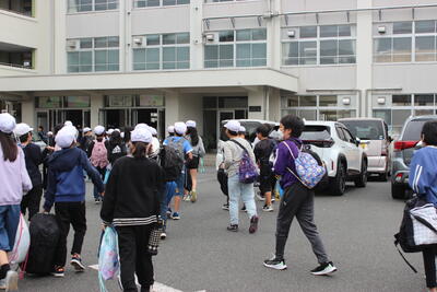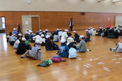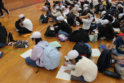 ほぼ予定通りに学校に到着しました。子どもたちの様子は、思っていたよりも元気でした。大きな荷物をもって体育館に集まり、野外活動の振り返りを行いました。今日はゆっくり休んで、明日も学校です!元気に登校してほしいと思います。