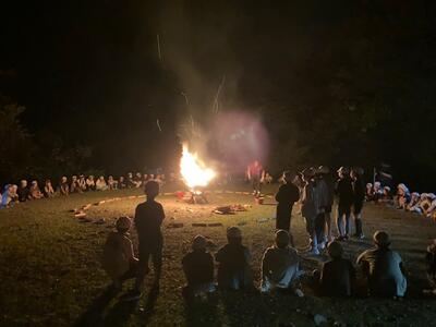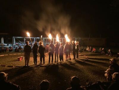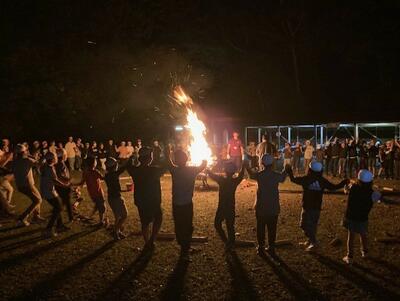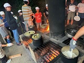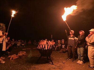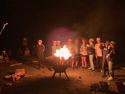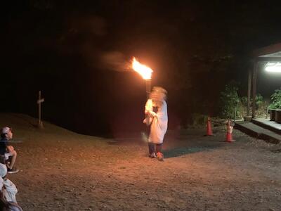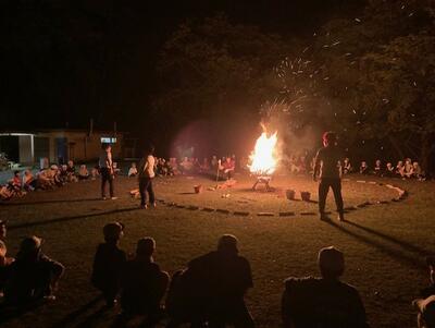 夕食を食べ、片付けが済んだらいよいよキャンプファイアーの時間です。火の神が登場し、子どもたちに火を分火し、点火します。火は大きく燃え上がり闇夜を照らします。マイムマイムを踊り、先生の出し物があり、各学級ごとの出し物で大いに盛り上がりました。