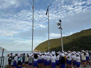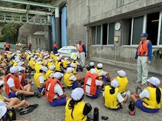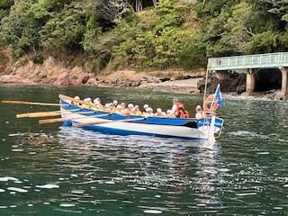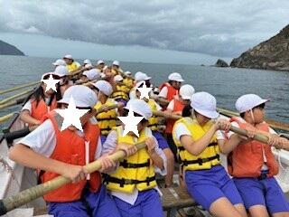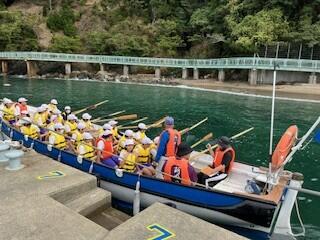 カッターボートと言われる手漕ぎボートに乗っての訓練体験です。チームで息を合わせて、オールの動きを合わせることで前に進みます。少し波があり、船酔いをする子もいましたが、全員で力を合わせて最後まで頑張りました。