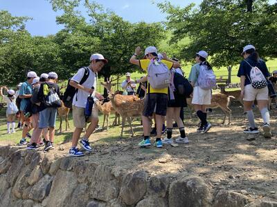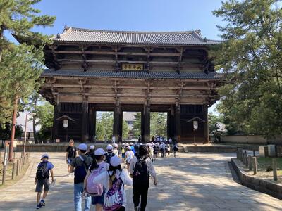奈良公園に到着しました。東大寺南大門から入り、若草山目指して歩きます。大仏さま、二月堂、四月三月堂、校倉造りなどなど歴史遺産を見学して行きました。午前中から気温は上昇!みんな汗をかきかき、頑張って歩きました。大仏殿では、みんな柱の穴をくぐりました。