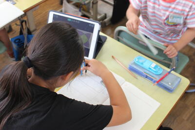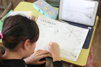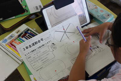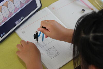 算数の学習です。毎年3年生が苦戦をする「コンパス」の使い方を学ぶ学習です。慣れてしまうとコンパスできれいな円を描けるようになるのですが、慣れるまではなかなか難しい道具です。いろいろな模様を作成することを通して、使い方に慣れていきます。