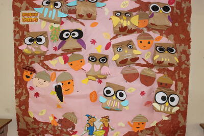 給食室に向かう廊下掲示板がひまわり学級の掲示板です。毎月季節に合わせた素敵な掲示がされます。自立活動の一環で飾り物を子どもたちが作成します。今月も素敵な掲示板になっています。