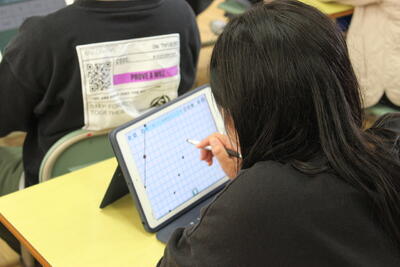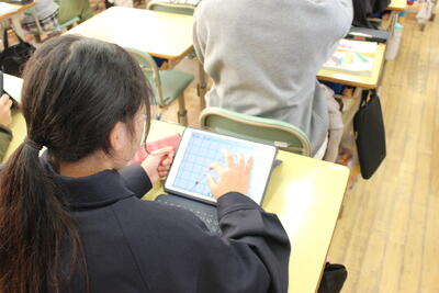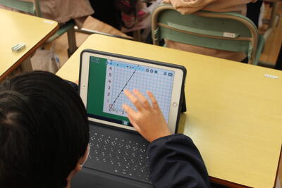 算数の学習です。比例と反比例の学習で、タブレット上にグラフを作成していきます。XとYの値をきちんと取り、交点に点を打ち直線で結びます。