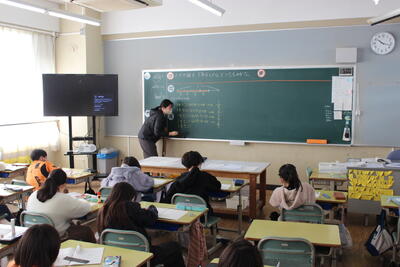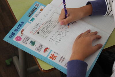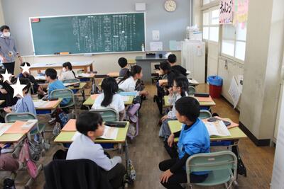 算数の時間です。分数の意味を理解する学習でした。「1を5つに等分した1つ分が5分の1」「1を5つに等分した2つ分が5分の2」と順番に唱えていきます。分数は中学・高校でも必要な重要な学習です。はじめが肝心です。みんなしっかり学んでいました。