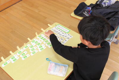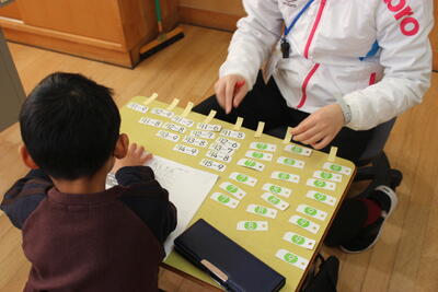 算数の学習です。計算カードを答えのまとまりで分けて、「○ひく○は○」と声に出しながら、カードを拾っていきます。仕組みを理解した後は、答えがすぐに出てくるように何度も唱えて覚えていきます。