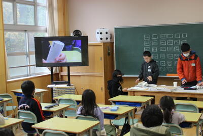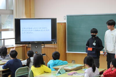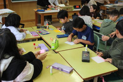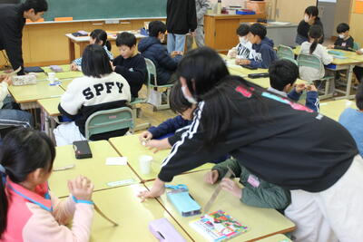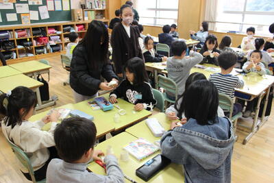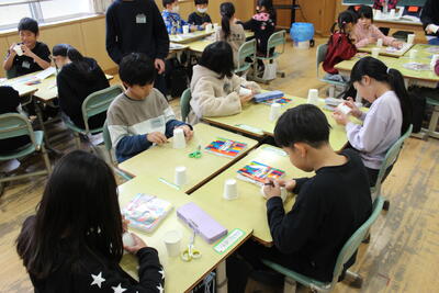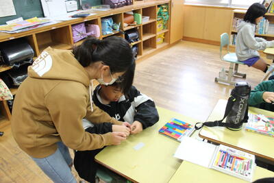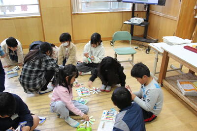それぞれのなかよし班で、6年生が考えた手作りおもちゃ作りをして遊びました。この日に向けて6年生がどんなおもちゃを作るか考えて、作り方の説明の仕方を工夫しました。タブレットを使い、制作工程を動画で撮影して説明する班もありました。さすが6年生!と感心しました。戸惑っている子にやさしく教える姿も頼もしく、ほほえましかったです。素敵な時間を過ごすことができました。