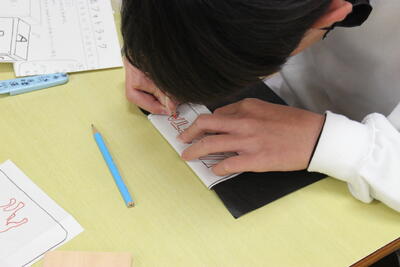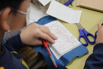 図工の学習です。6年生がいよいよオルゴール箱の制作に入りました。毎年6年生は卒業記念として制作しています。6年間の思い出を限られたスペースですが板の上に表現し、彫りこんでいきます。今日は下絵を写す作業でした。