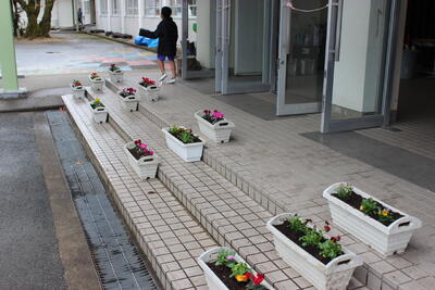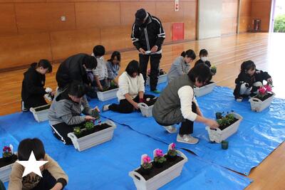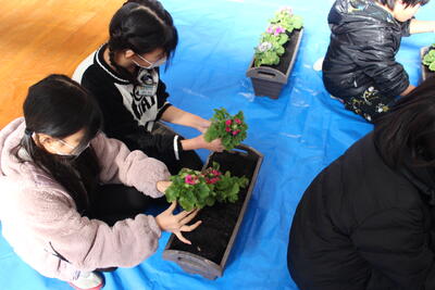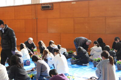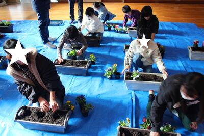 今日は4・5年生を対象に花いっぱい運動を行いました。4年生以上は花を植えます。天候が悪く体育館での作業になりました。花を折らないようにやさしく丁寧にそっと植える姿がほほえましかったです。
