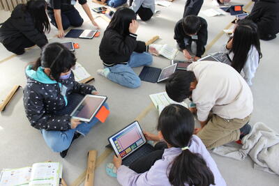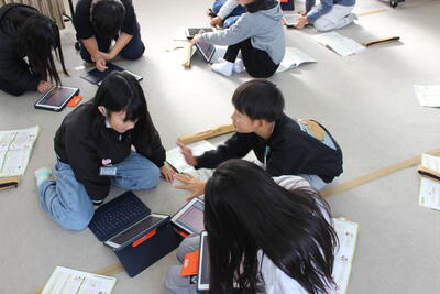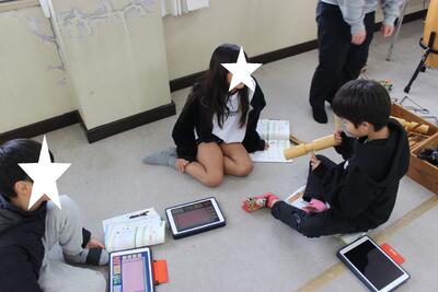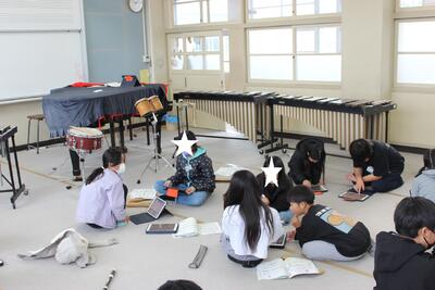 音楽の授業です。リズムに合わせて、楽器を選び演奏します。グループでリズムに合う楽器を考え、構成を決めました。