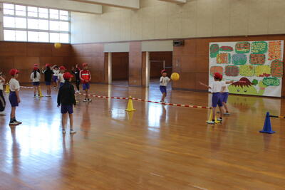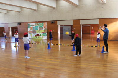 体育の授業です。ネット型ゲーム「プレルボール」という種目に取り組んでいます。サーブを相手コートに投げ入れます。受け手は、来たサーブを手で打ち、味方にパスをします。2回つないで最後はボールつかんで相手コートに投げ入れるという攻防を繰り返します。上手にバウンドで打ち返し、最後は相手コートのどこに投げ込むかが勝負のポイントです。夢中になって取り組んでいます。